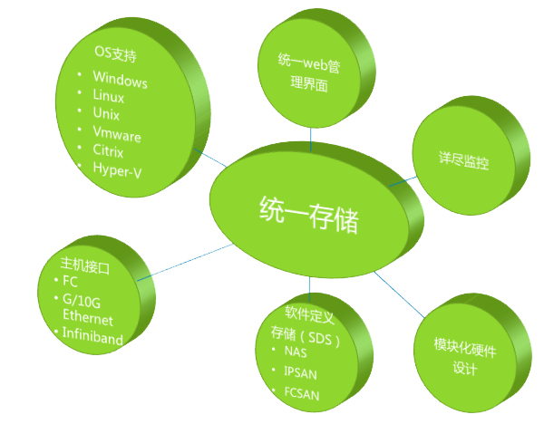 模塊化設計 軟件定義存儲(SDS) 同時支持NAS/SAN功能 可選支持千兆/萬兆網絡/FC/IB等主機接口 支持VMWare、Citrix、Hyper-V等系統